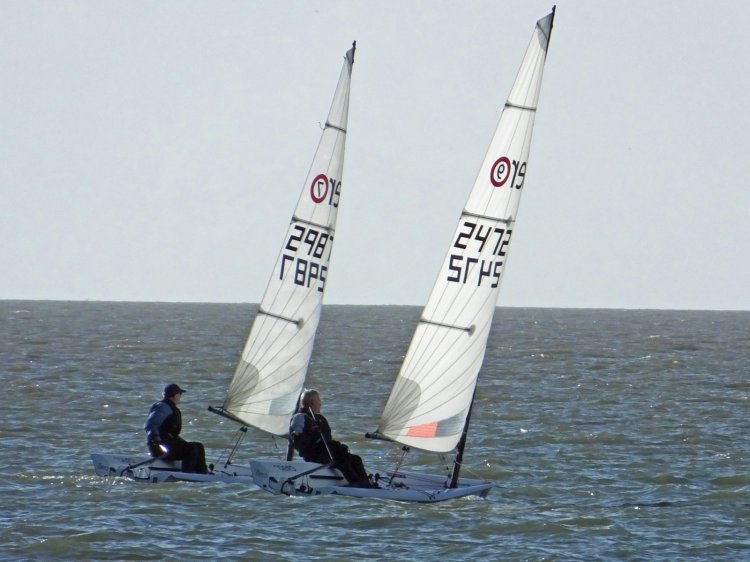Blues skies, sunshine and a light force two south-westerly breeze greeted the competitors as they rigged their craft at the water’s edge. The course was set to ensure a beat on the first leg but as the boats jostled for position, prior to the start, so the wind backed southerly which, disappointingly, meant the helms, by standing out at the Outer Distance Mark, could make the Eastcliff buoy without the need to tack. Ken Potts in his RS Aero lead the fleet but as he reached the first mark his tiller sheared from the rudder stock; howeve,r using his ingenuity and a lot of skill, he managed to continue racing and maintained his lead out to the Seaward buoy on a reach. There then followed a gybe before a broad reach in to the AWS buoy; Brian Allen, in his RS Aero, closing the gap all the time, and Derroll Pedder, also in an RS Aero but with a smaller rig, only just behind. A second gybe followed before heading up the coast to the Preston Park buoy, which required a third gybe, and then in to the Kingscliff mark. By now the wind had freshened and was touching a force four which, coupled with a flat sea, made for perfect sailing conditions. The final leg was close-hauled back to the line and it saw Ella Langfeldt leading on handicap, in her Nimbus, by just one second. It was as they continued onto the next lap that Potts’s tiller finally gave up the ghost and with his boat rounding-up into wind, it gave the perfect opportunity for Allen to sail past and head the rest of the fleet on the water. But try as he must, he couldn’t shake off Pedder who was determined to give Allen a run for his money. As the second lap concluded, Pedder’s hard work had paid off and he was now in first place, a position he went on to strengthen in the third and final lap, pushing Langfeldt into the second position.