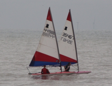 Meanwhile, ten minutes later it was time for the Cadets to take part in their race but the Toppers all found themselves being dragged up the coast by the tide, and it was clear they would never get to the start line. In the main race it was Tappenden first round the Eastcliff buoy, followed by Heath, and then Potts, and these positions remained the same as the second mark, at Preston Park, was rounded. With the tide now under them, the three approached the Lilley Farm buoy in the same order but attempting to head out to the Seaward buoy proved just too much, and eventually they agreed to call it a day and were grateful for a tow by the Rescue Boat back to the Club.