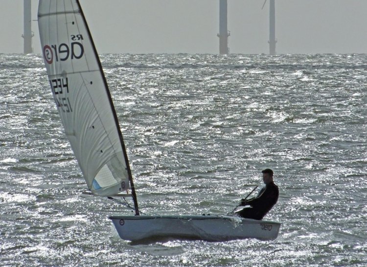 All the competitors chose their smallest rigs as they set-up on the beach, whilst some rather vicious gusts blew through. Despite the winds being predominantly westerly and therefore slightly offshore, the somewhat flatter sea close to the beach soon morphed into more turbulent waters topped with white caps. As the boats launched it soon became very clear that this was going to be no easy ride. With the experienced crew of the Club’s Rescue Boat on the water and always ready for action, so the capsizes began to occur; even before the race had got underway. Tim Dye was the first to go over in his RS Aero but he soon had it up, whilst Tom Bartlett was the next to go over in his TS Aero. Derroll Pedder, in his RS Aero, and Simon Kedge in his Laser, both chose to retire. With just seconds to go before the start, Brian Allen capsized in his RS Aero and drifted the wrong side of the line whilst Ken Potts just lifted his wings of his RS Aero and simply flew towards the Kingscliff buoy on a screaming reach. Bartlett capsized again and had a number of attempts at righting his craft whilst Allen, having got his boat upright, headed back to the line but then decided that it might be better to retire safely back to shore. Bartlett, with the Rescue Boat standing by him, eventually got the boat upright but he too felt enough was enough and headed home. Meanwhile Dye misread the start sequence and, believing he still had one minute to go, ended up having a very poor start, realising he had a lot of catching up to do. The second leg was another reach out to the Seaward buoy before hardening up and beating in to the Eastcliff mark. It was on this latter leg that Dye closed the gap on Potts but not sufficient to threaten him at this early stage in the game. It was then out to the Lilley Farm buoy before a second beat to Eastcliff and a final reach back to the line. At the end of the first lap it was a comfortable lead for Potts and, try as he might, Dye only narrowed the gap by four seconds on the second lap; although a third lap had been planned, the Race Officer shortened the course, resulting in Potts taking the winning gun. However, overall in the series, it was Dye that claimed the trophy.